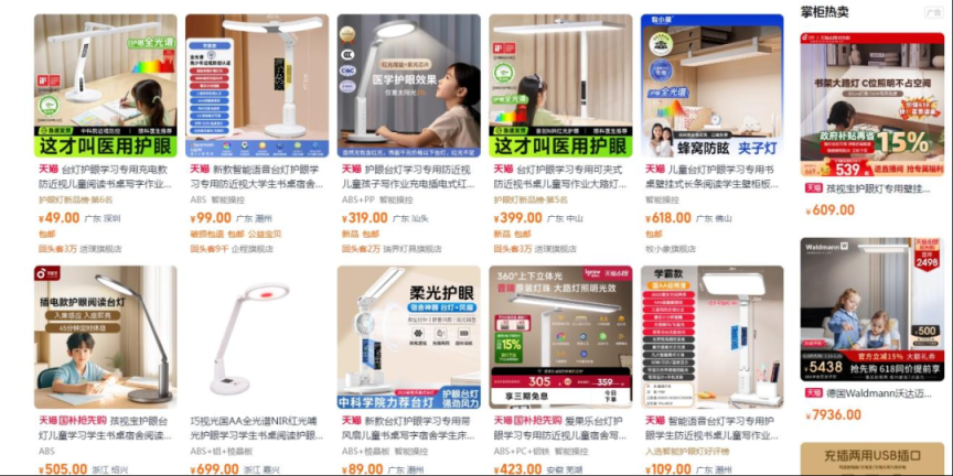 在电商平台搜索“读写作业台灯”,各种功能宣传令人眼花缭乱:“全光谱”“零频闪”“医用护眼”“纳米防眩”“零蓝光”等词汇随处可见,产品价格从几十元到上万元不等。